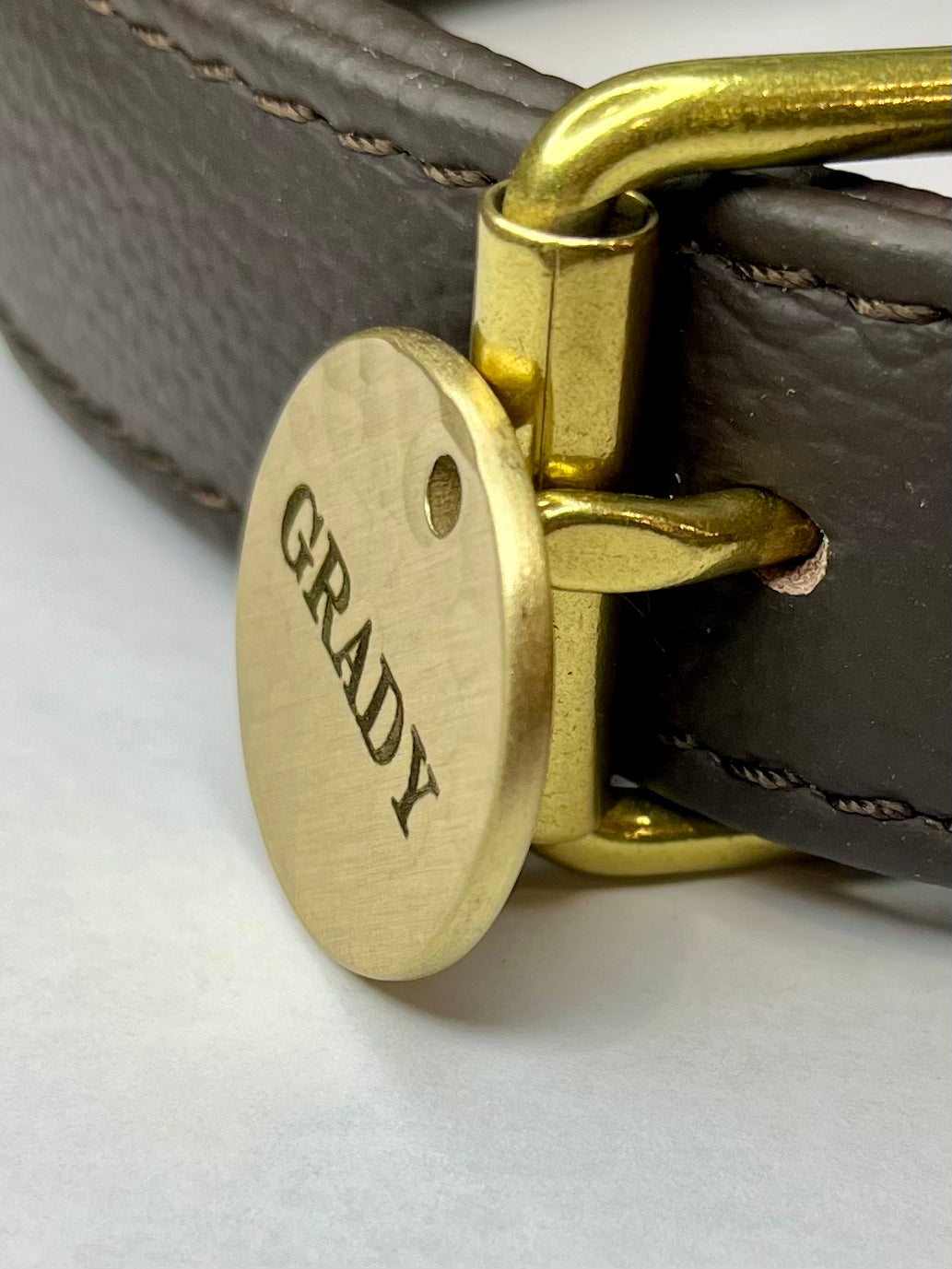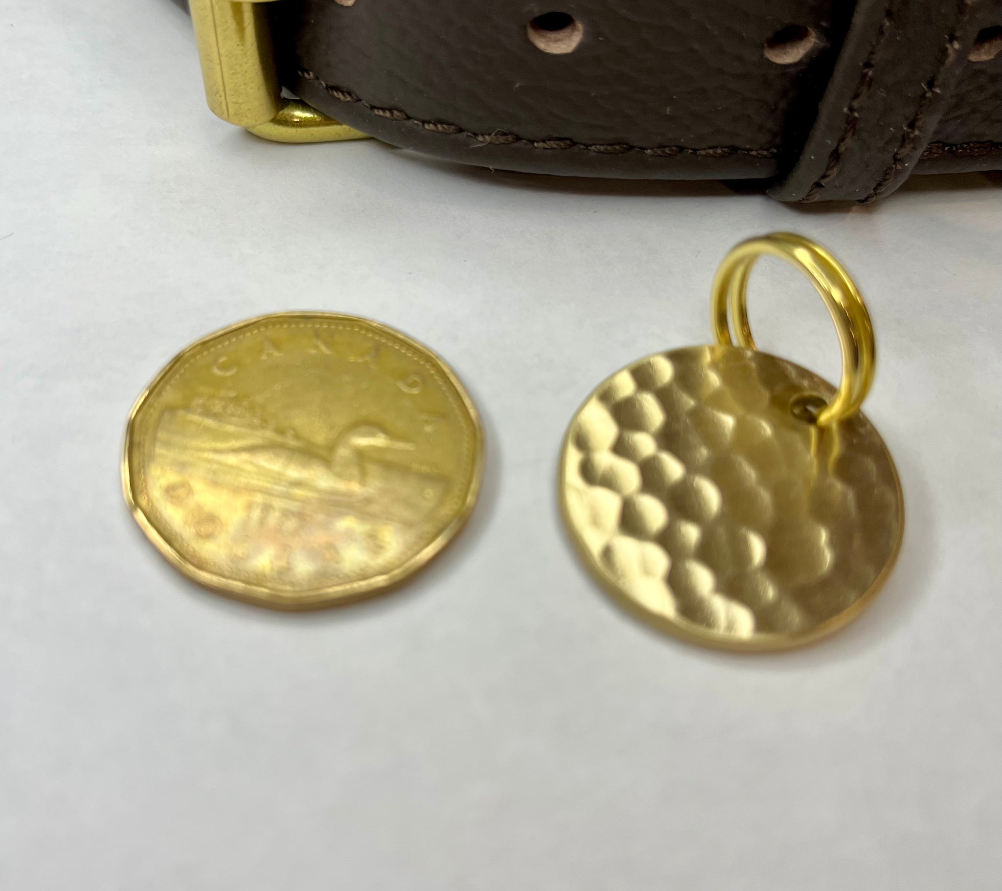 Each tag is round and measures 25mm x 25mm, offering excellent visibility without being bulky. Crafted from high-quality solid brass, it’s built to withstand daily wear while developing a natural patina over time that adds character and charm.